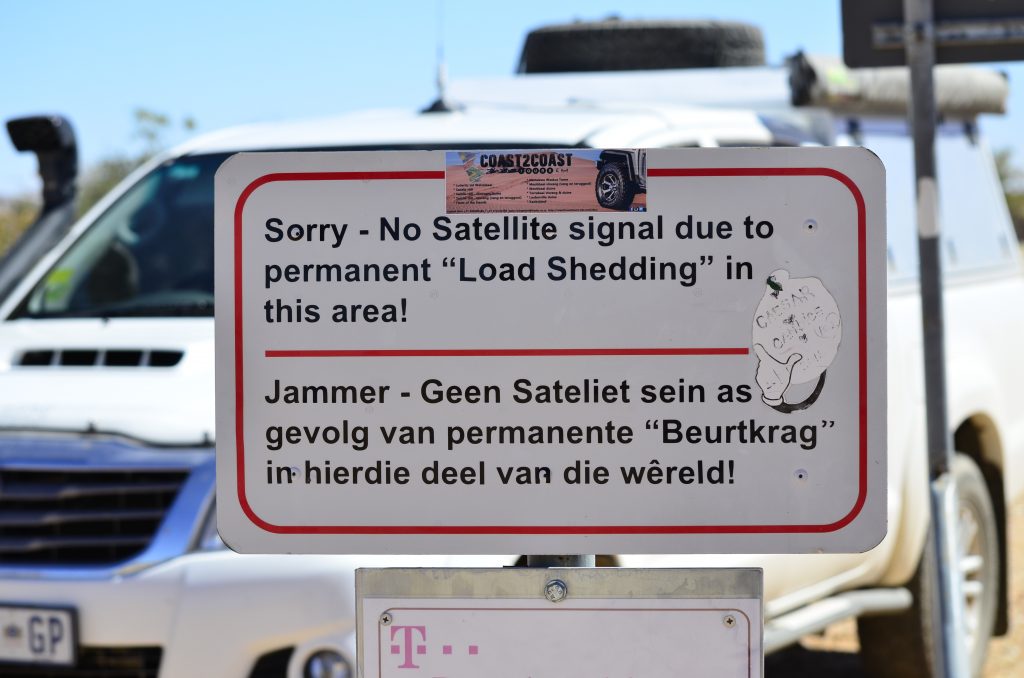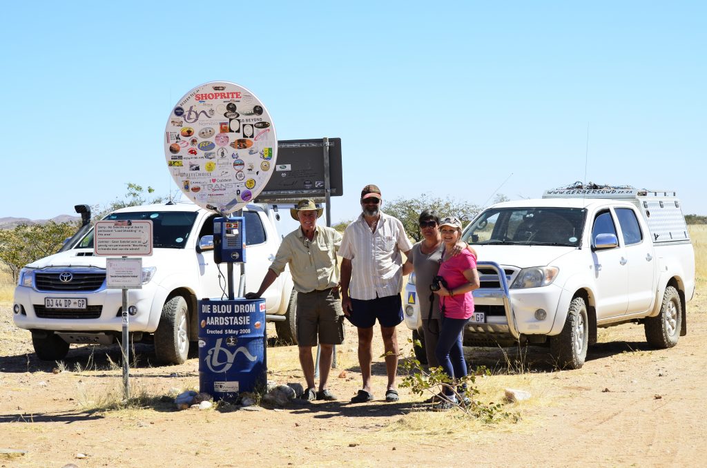 Dit gons behoorlik oor die radios (het vir Cobus my handradio gegee) as ons verlore jare wil opvang. By Bloudrom stop ons en geniet padkos so tussen die gesels deur. Kan weer nie glo ons loop mekaar hier raak nie. Ons verkyk ons aan die talle items wat hier aangebrings is : ‘n Telefoon hokkie en satelietskottel met byskrifte wat jou laat skater. Cobus en Liezel draai terug en ons vat die pad Suid, nadat ons eers padkos geniet het. Van hier af raak dit weer vlakte, met geen gras nie en net klippe so ver die oog kan sien.