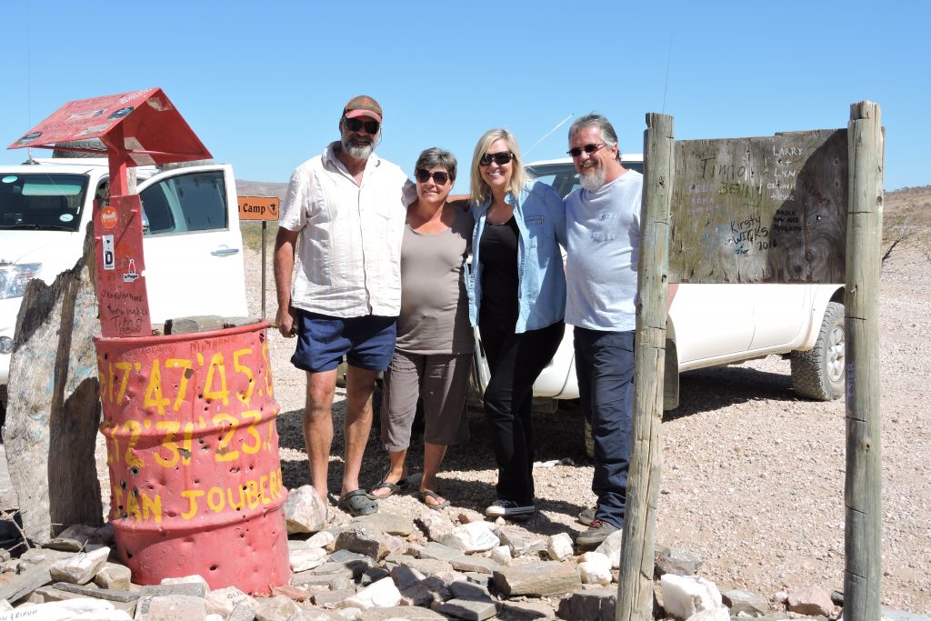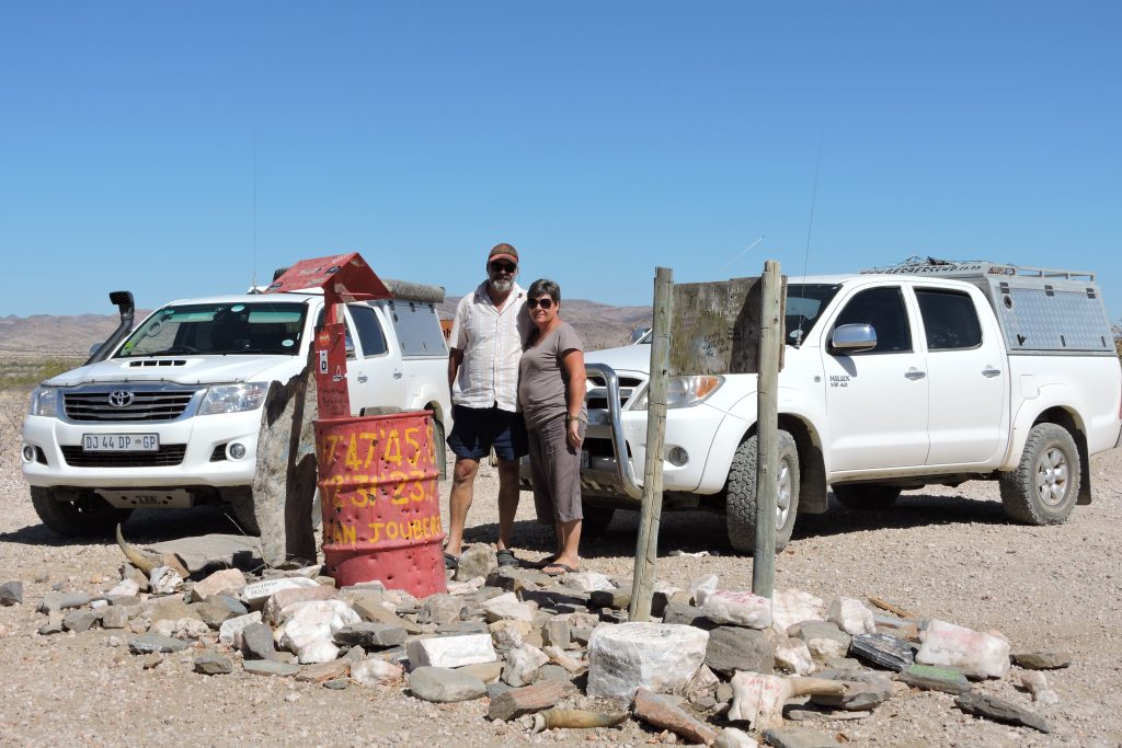 By Rooidrom word daar gestop om eers weer ‘n klip te pak, jou naam en datum op die klip te skryf om te sê jy was ook hier. Dis terwyl die kameras so klik, klik, dat my oog die voertuig raaksien wat uit die Suide ons kant toe kom. Dan stop hy ‘n paar honderd meter van ons af en ek wonder wat aangaan. Ons wag ‘n rukkie en hy kom nader en stop weer. Ek stap nader om kennis te maak en te hoor van waar hulle kom en waarheen is hulle oppad. Dis toe ek my kop by die passasierskant se venster sit dat ek my oë nie kan glo nie!