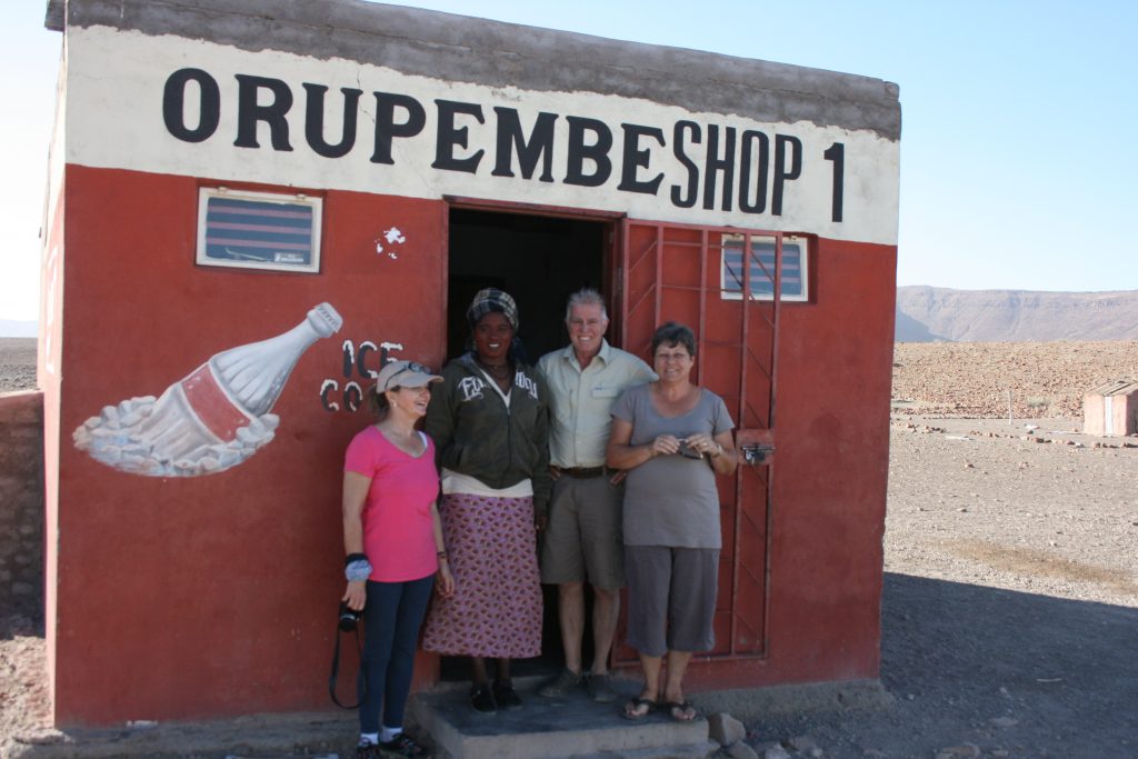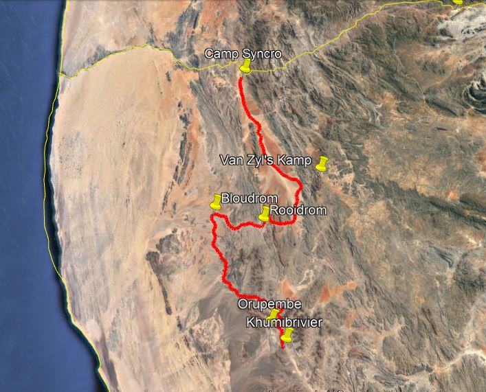 Die sowat 70km vanaf Bloudrom tot by Orupembe neem ons die beste part van 2 ure en is net voor 17:00 by die polisiestasie op Orupembe. Die is ‘n baie netjiese groot gebou en veilig toegekamp. Die polisieman stap nader en groet vriendelik in Afrikaans. Ons doen navraag oor die roete van hier af Purros toe, waar ons môre aand wil kamp. Hy beduie hoe om te ry om by die Khumib rivierpad uit te kom wat ons deur die Olifant Vloedvlakte sal vat tot by Purros. Hy sê dis veilig en kan enige plek in die rivierbedding kamp.
