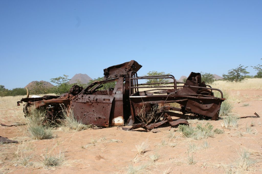 Die eerste stop, nie ver van die afdraai na die voet van Van Zyl’s pas nie, is die wrak van die Land Rover wat tydens die grensoorlog ‘n landmyn getrap het. As ons so langs hom staan, flits ‘n paar beelde deur my gedagtes, die tyd toe ek hier bo was tydens die grensoorlog.
