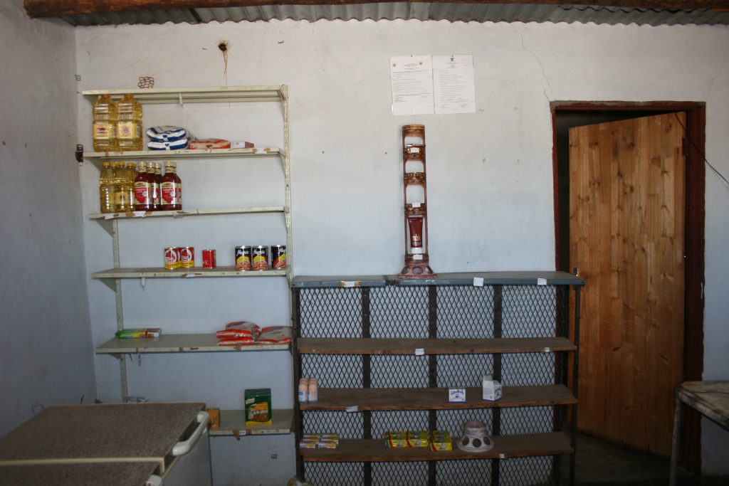 Ons ry eers by die winkeltjie, ‘n geboutjie van 3m x 3m, verby en is nuuskierig om binne te gaan kyk. Die vrou groet vriendelik en sê die voorraad is min, net ‘n paar blikkies baked beans, tamatiesous, olie en seep op die rak. Sy sê dit was ‘n besige naweek en sy is uitverkoop. Wonder so by myself wat “besig” vir haar beteken, dalk 6 of 8 items verkoop ?