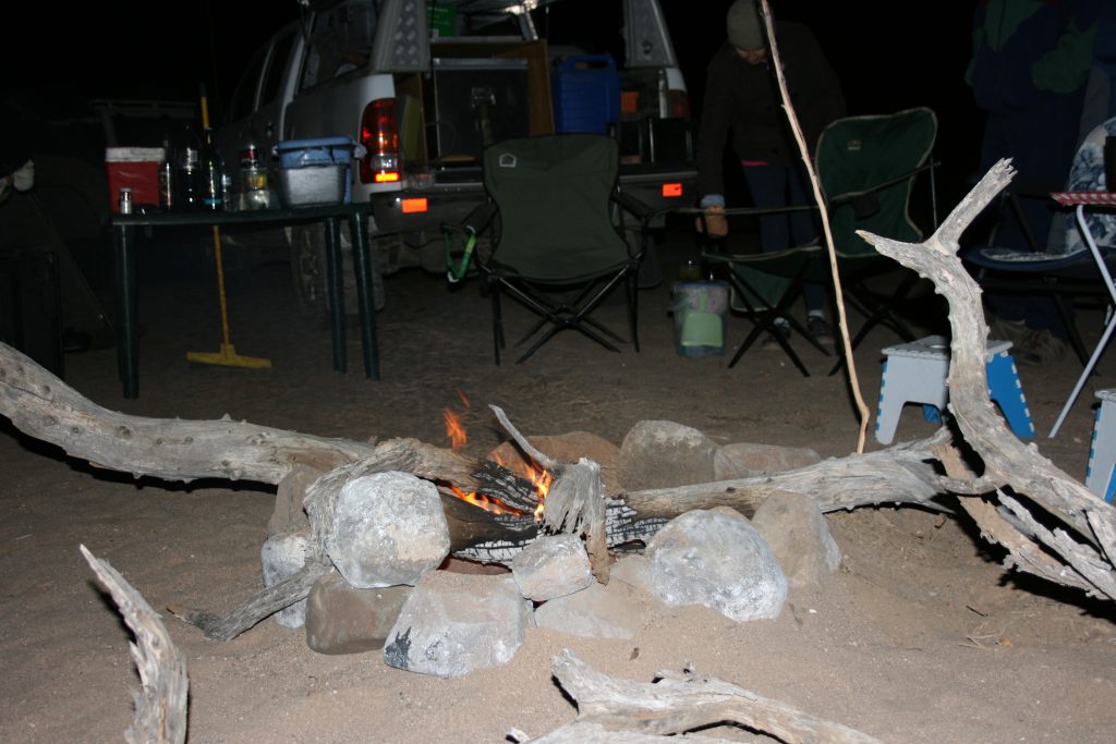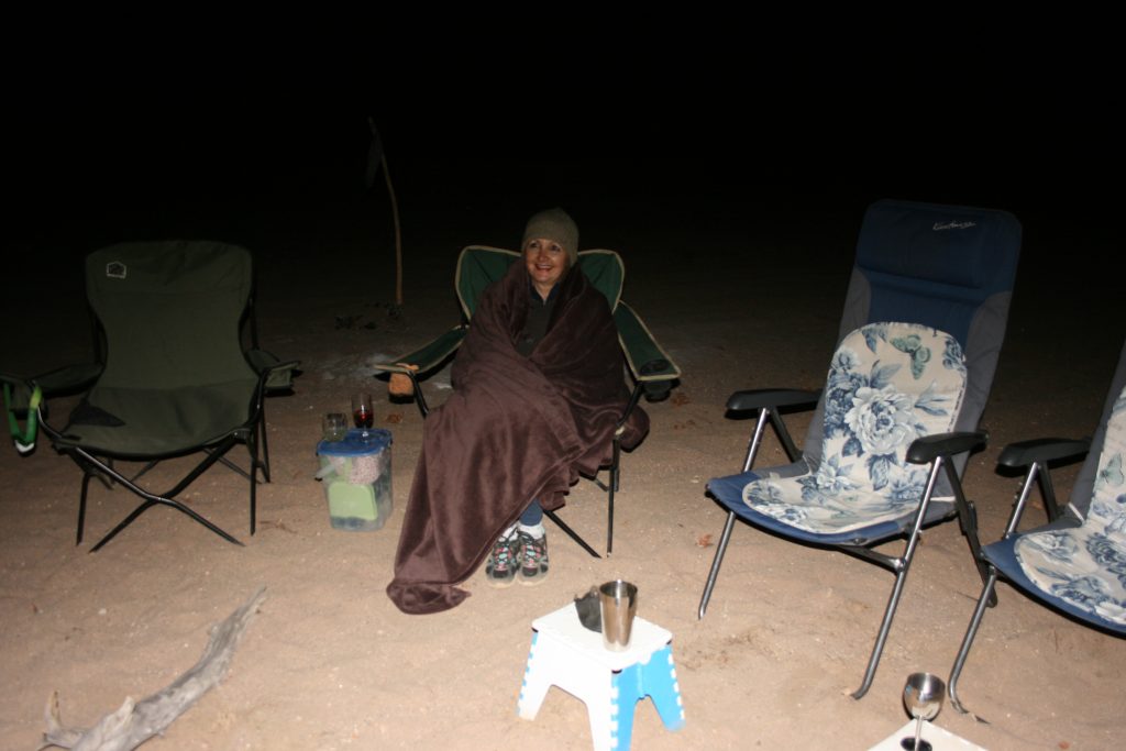 Ons sit tot laataand om die kampvuur en gesels, kan nie uitgepraat raak oor die ervaring tot nou toe nie. Dit het lekker koud geword en ons gooi nog hout op die vuur vir ‘n bietjie hitte – Elsa het haarself in ‘n kombers toegerol.
