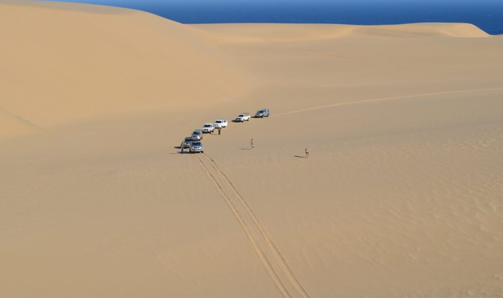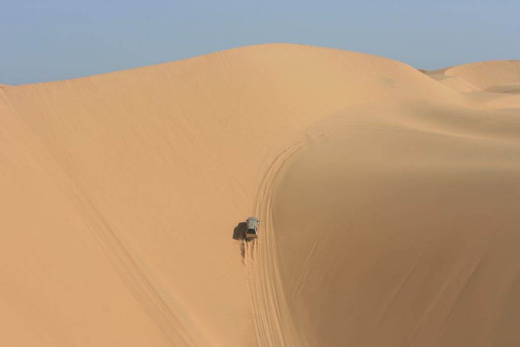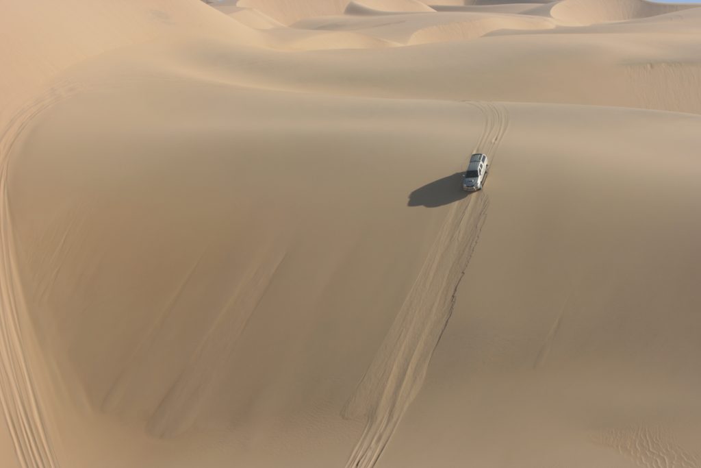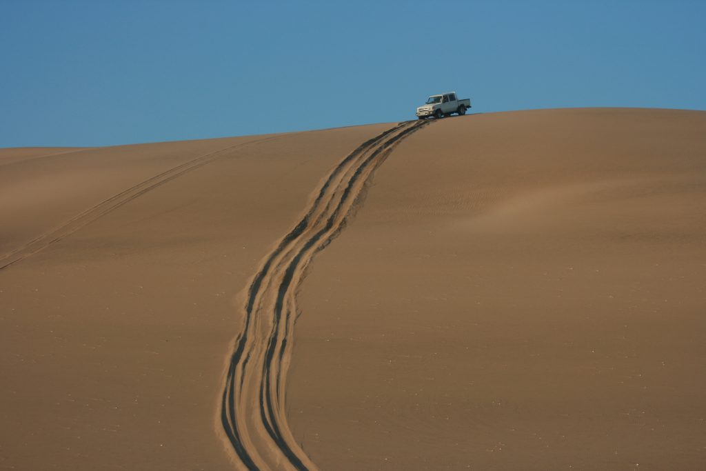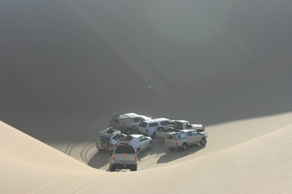 Ramon roep halt hier voor bo op die groot duin. Van hier af kan jy ‘n figure 8 baan ry, een voertuig op ‘n slag. Hy vat voor en is deurgaans op die radio om te vertel waar jy poeier gee, stadiger ry en pasop vir hierdie een jakkalsie op die afrdaend. Hy vat hom ‘n tweede keer en wys ons die roete wat jy vat, as jy dit nie die eerste keer gemaak het nie, om weer hier bo uit te kom.