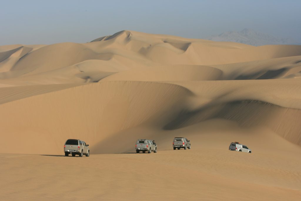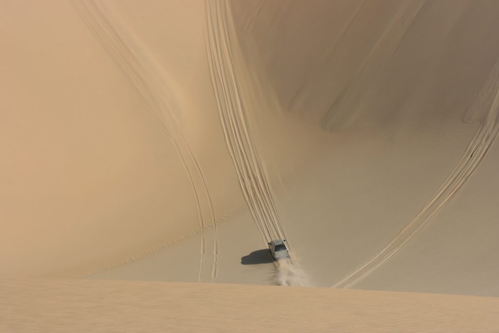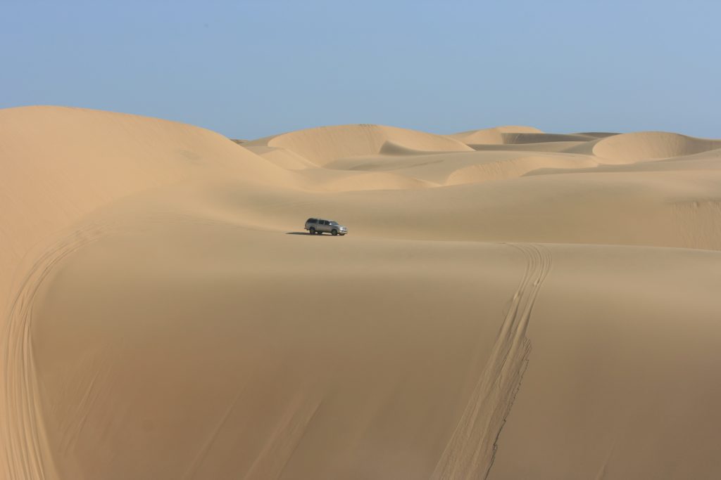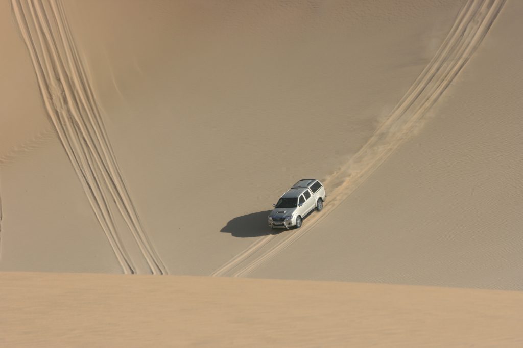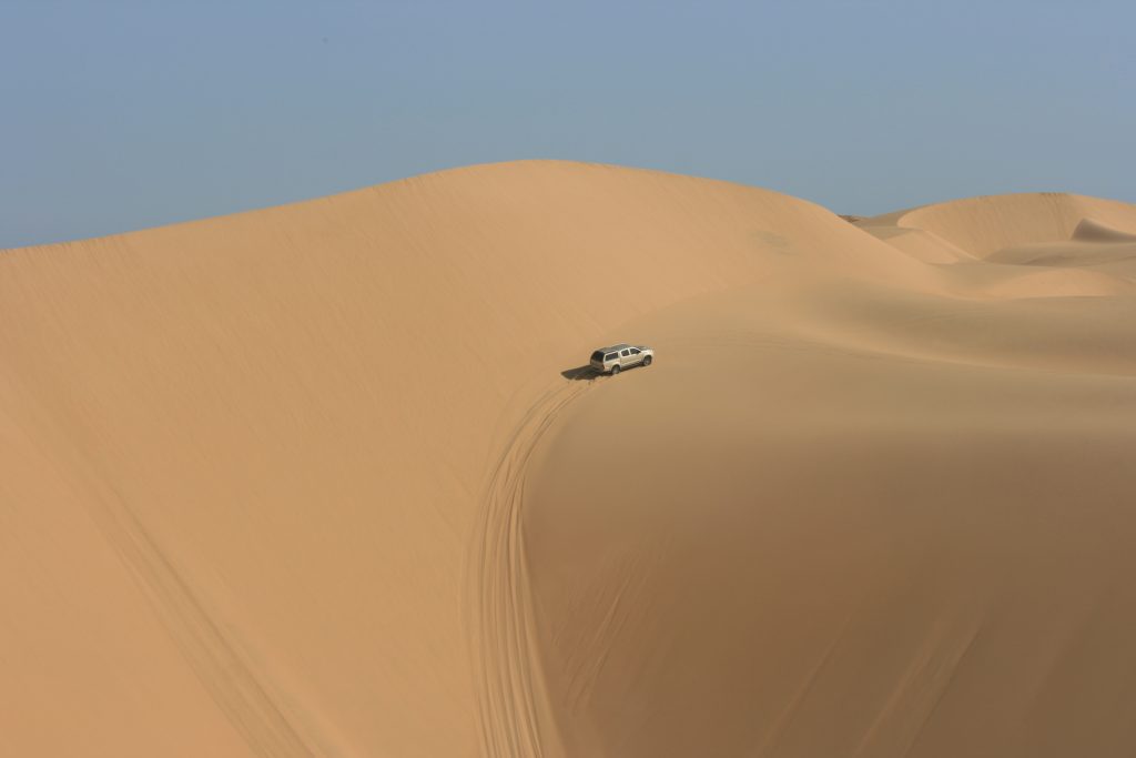 Ramon roep halt hier voor bo op die groot duin. Van hier af kan jy ‘n figure 8 baan ry, een voertuig op ‘n slag. Hy vat voor en is deurgaans op die radio om te vertel waar jy poeier gee, stadiger ry en pasop vir hierdie een jakkalsie op die afrdaend. Hy vat hom ‘n tweede keer en wys ons die roete wat jy vat, as jy dit nie die eerste keer gemaak het nie, om weer hier bo uit te kom.