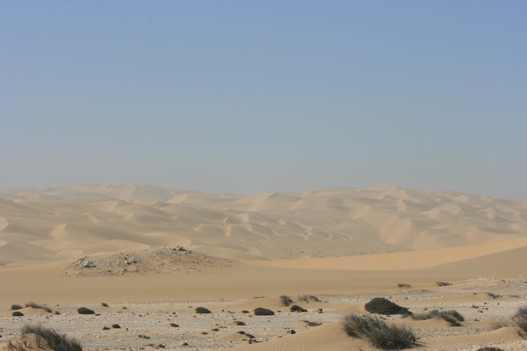 As almal klaar gespeel het, sommige manne sommer drie keer die roete gery, gaan ons dieper die woestyn in. Ramon praat van ‘n wegkruip plek wat hy ons wil gaan wys. Dis ‘n “gat” waarin ons afry en moet mooi parkeer onder om al die voertuie in te kry. Dan gaan ons weer een een uit, meeste eers met die tweede of derde aanslag. Dis moeilik, want jy het nie ‘n aanloop nie en die sand op die steil duin hier voor ons is baie sag. Een van die manne het amper sy voertuig verloor, het nie op die spoor gebly nie en te links gery. Hy het vasgeval, gelukkig, want ‘n halwe meter links van waar hy staan is ‘n BAIE hoë slip face. As hy nie vasgeval het nie, of ‘n meter verder links gery het, was hy weg !!!