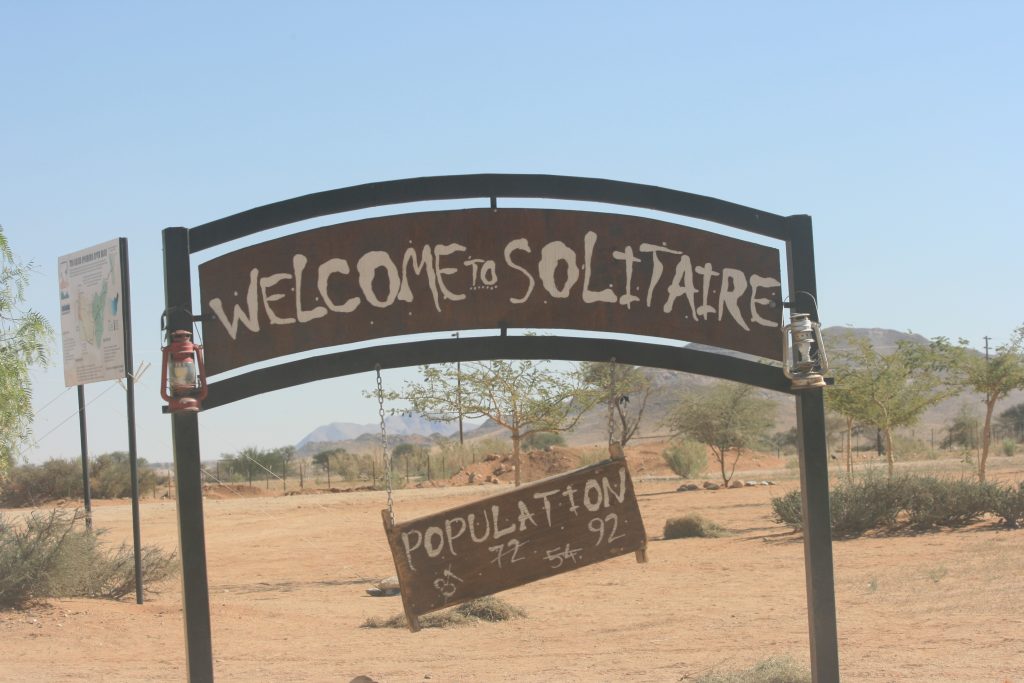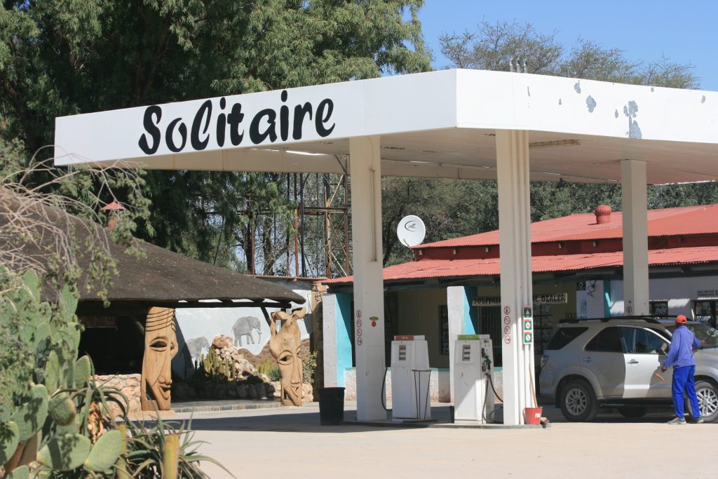 Dis net voor 11 as ons by Solitaire intrek. Gaan eers barandstof volmaak en ietsie kry vir die hol-kol op die maag. Moet sê, die winkeltjie hier is redelik goed gestock, ‘n ietsie van alles. Veral die eetgoedjies lyk smaaklik op die tafeltjies waar die mense sit en eet. Ons gaan sommet ‘n take away vat, nog ‘n ver pad om te gaan.
