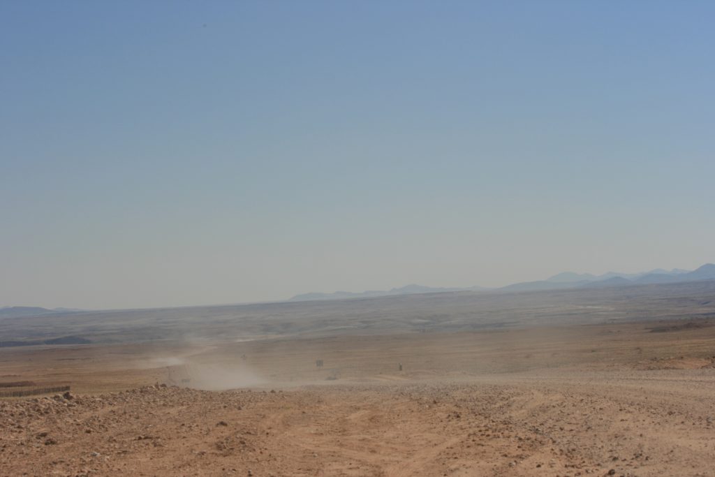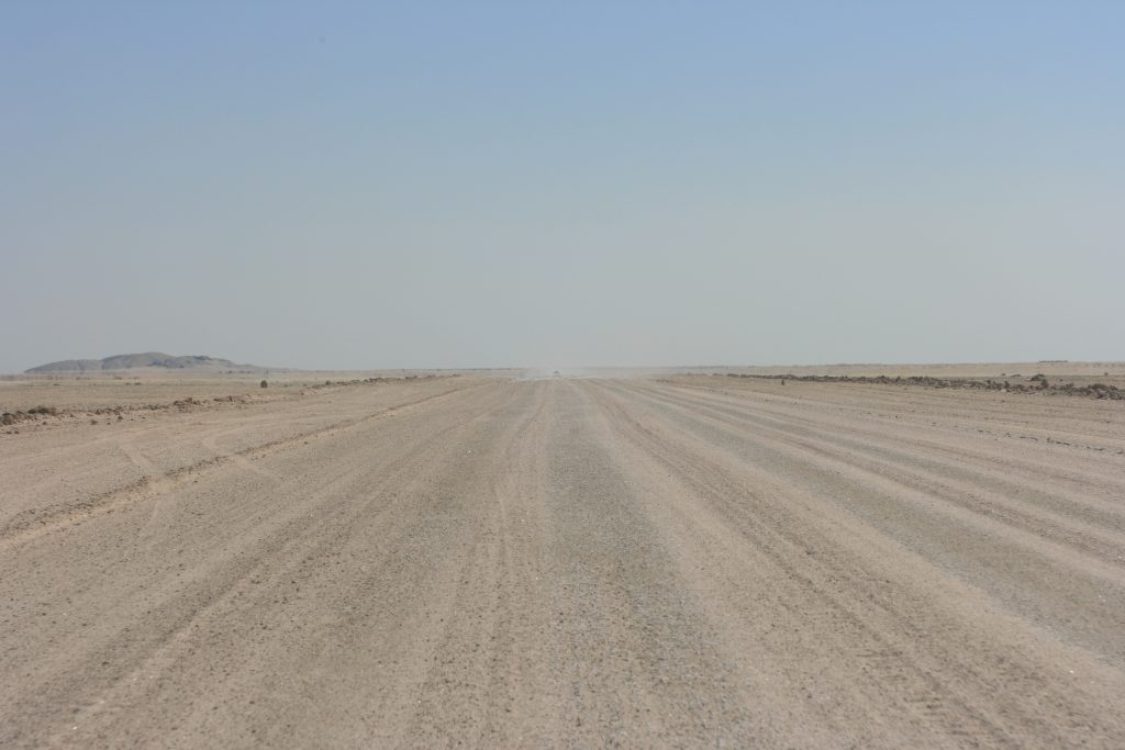 Dis net ‘n ent anderkant die Kuisebpas, as jy die vlakte ingaan, dat die woestynpad begin. Dis ‘n lekker breë grondpad en ons vorder vinnig. Van die laaste dele is die pad met sout bedek en dit voel eerder of jy op ‘n teerpad ry as op grond.