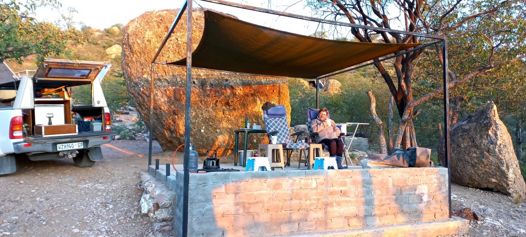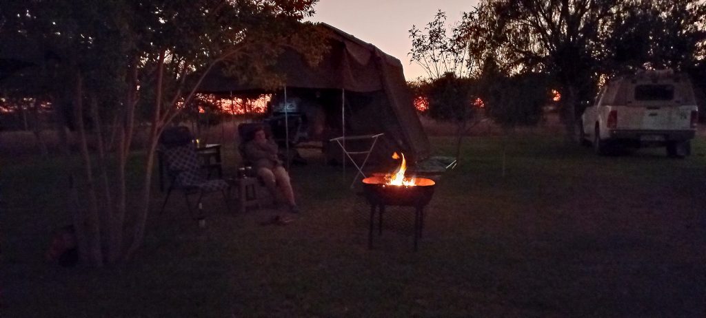 Dis net na ses as ek die vuurtjie aansteek. Die tjops wat ons in Khorixas gekoop het is amper nekvleis, maar gaan vanaand gebraai word. Dis ons laaste vleis en sal more weer aanvul, het al voorheen baie lekker vleis hier by n slaghuis in Outjo gekoop.