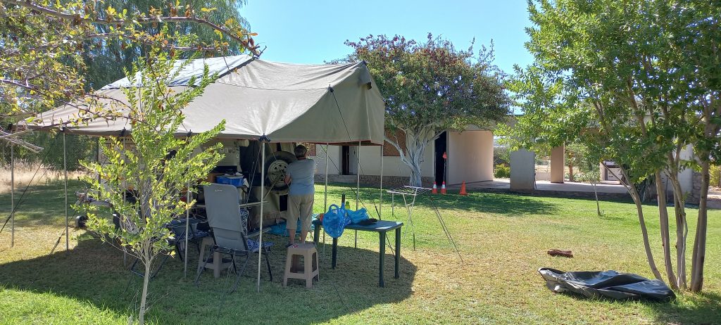 Dis Sondagmiddag en ons is net rustig in die kamp. Sal more gaan aankope doen en soek vir ‘n groot wasser om die knip wat wil uitskeur te verstewig. Ons gebruik die gratis Wi-fi by ontvangs om op datum te kom met ons kommunikasie.