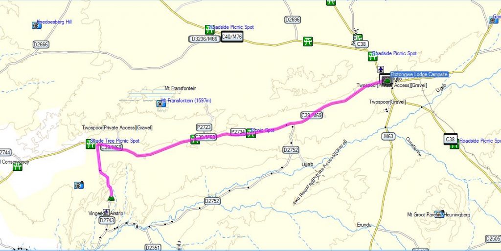 Ons is net na nege weer terug by die kamp en die afslaan gaan vinnig. Ons vat die 14 km op die D2743 maar rustig. Ons draai regs op die C39 en die 80 km teerpad tot by Outjo gaan vinnig. Dis as ons ‘n ent op die teerpad is dat my oog die sleutel langs my twaksak vang, dis die ablusie se sleutel. Gaan nie nou terugdraai nie en sal op Outjo reëlings tref met hulle hoe ons gaan maak.