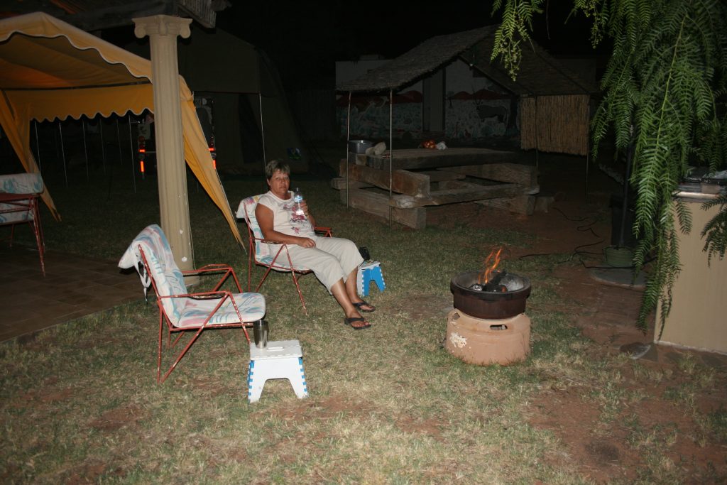 Die glasie wyn langs die vuur gaan goed af, die 610 km was ‘n lang pad. Dis lekker weer en redelik warm as ons lank na ete buite om die vuur sit en kuier.
