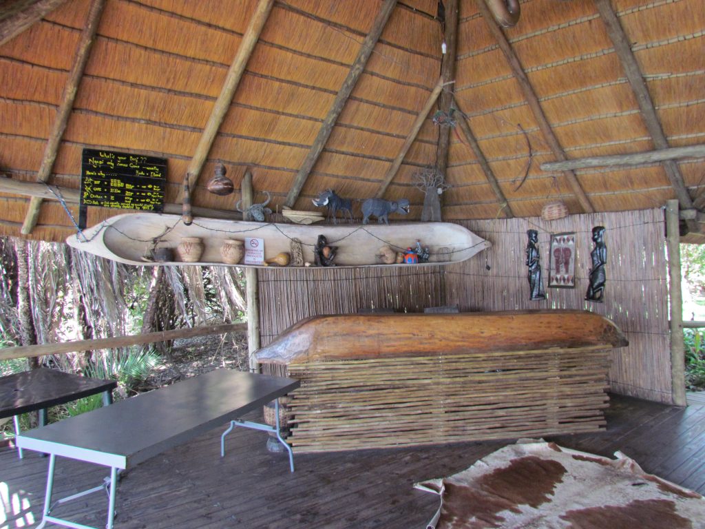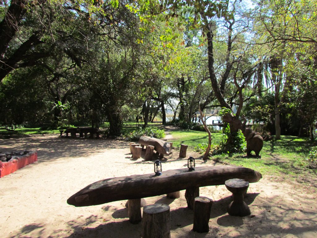 Die oase wat ons begroet as ons by die ontvangs stop is onbeskryflik mooi. Pragtige grasperke tot teen die rivier met die groot bome wat oral koelte gee. Die vriendelike ontvangs en die aanbied van ‘n koppie koffie, al moet jy dit self maak, is rêrig 5 ster. Die koffie op die blad langs die lapa is gratis en jy kan jouself kom help, soveel kere as wat jy wil. Jy verstaar jou aan die kroeg area met al sy “versierings” en geskrifte. Ons boek in en die kaart wat die vrou vir ons gee wys waar ons kampplek is.