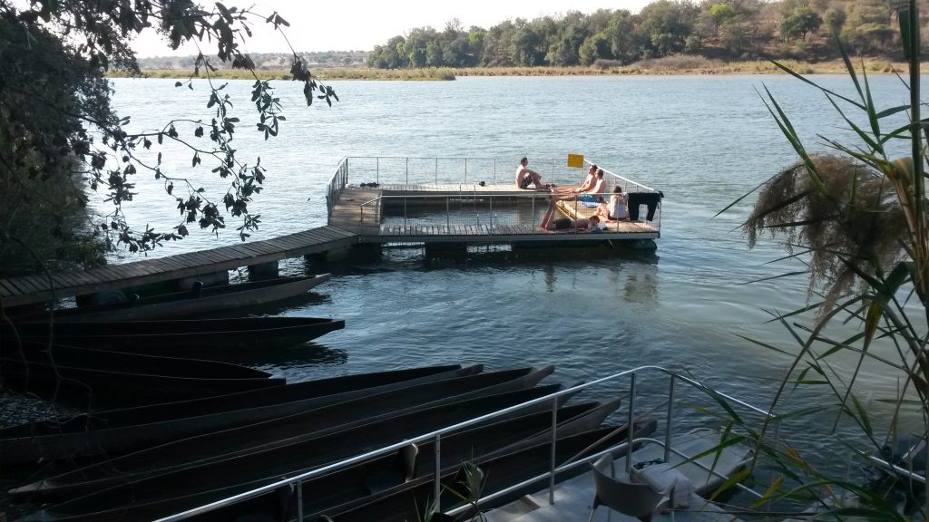 Die “swembad” by die lodge, wat in die rivier dryf, vang jou oog onmiddelik. Dis ‘n stelasie wat op dromme dryf, met mech in die middel, wat die swembad vorm. Dis natuurlik om jou veilig te hou teen die krokodille en seekoeie as jy swem!!