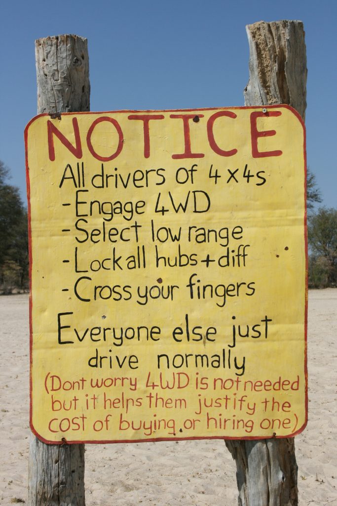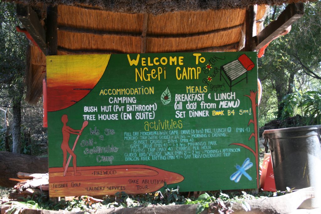 Dis 13:30 as ons die afdraai na Ngepi vat. Was nog nooit hier nie, maar het al BAIE gehoor en gelees van die plek. Het al voorheen by ander plekke in die omgewing gekamp, maar nog nie hier nie. Dis sommer met die indraaislag wat jy eers stop en die bordjies langs die pad lees, ‘n MOET! Ek hou van die mense se sin vir humor en weet sommer ons gaan dit geniet.