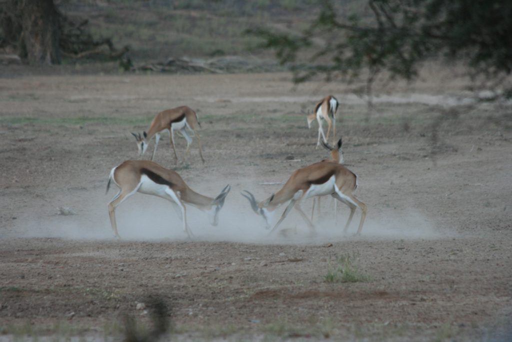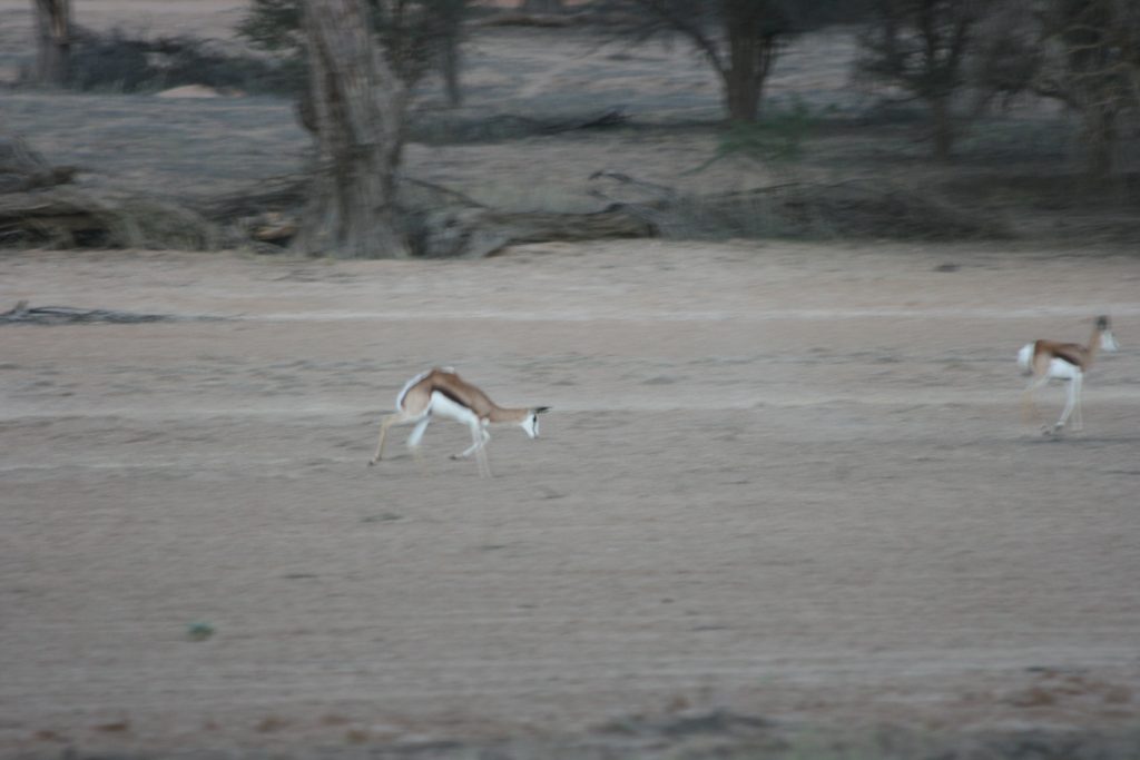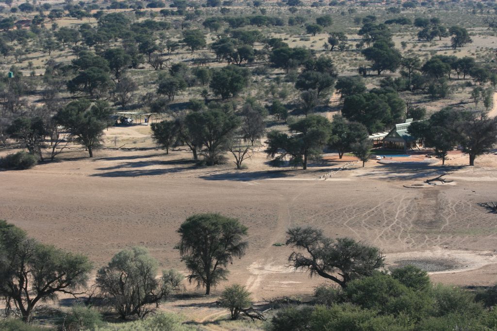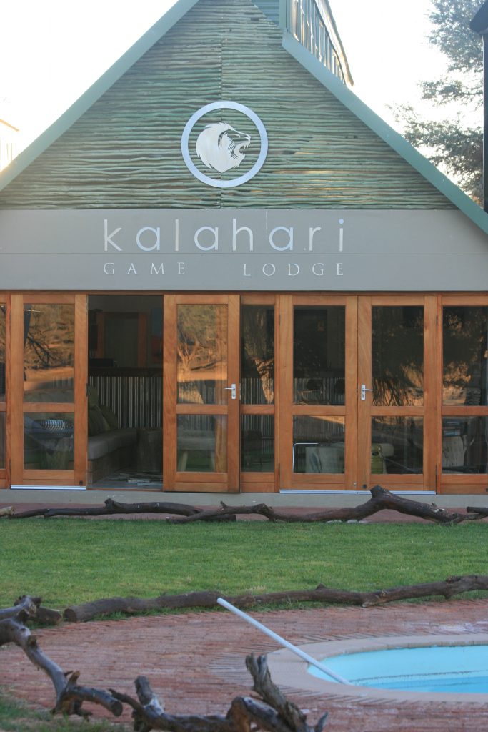Ons slaan kamp af en gaan groet die eienaar. Ons ry die 130 km goeie grondpad, verder in die Auob rivier vallei af met sy pragtige natuurskoon. Dis net voor 2 as ons by die Kalahari Game Lodge inry. As jy by die ontvangs aankom, lyk dit soos ‘n oase in die woestyn met die groen gras hier voor om die swembad.