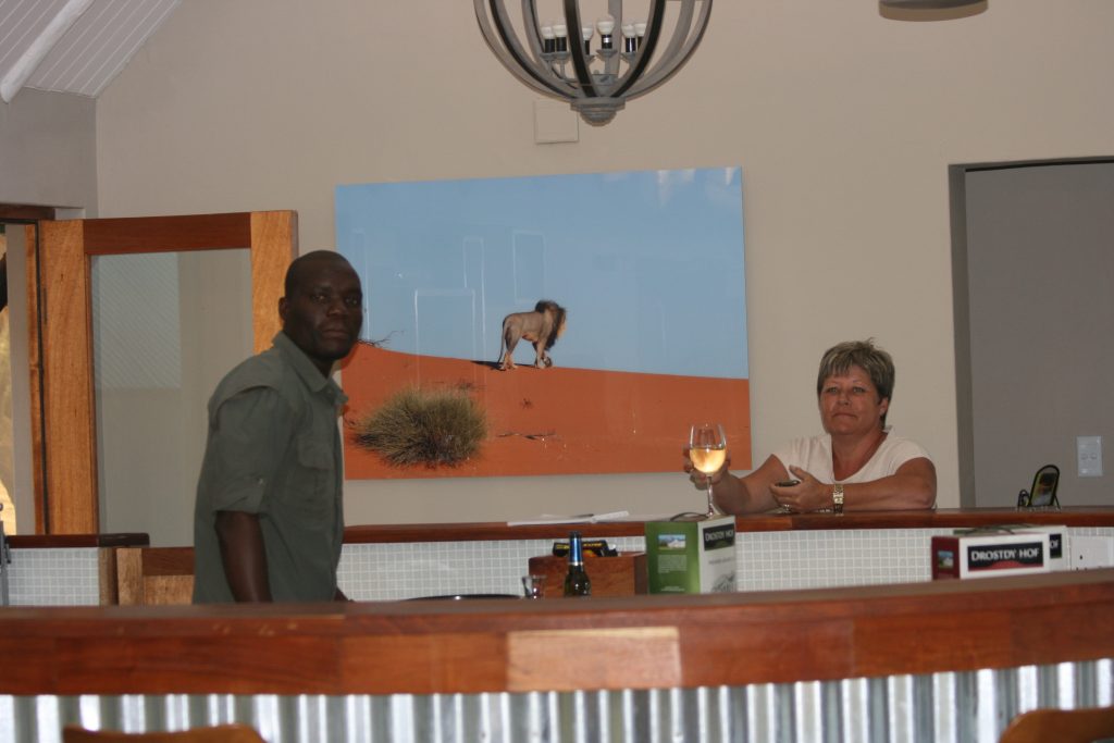Ons stap terug lodge toe en besluit om ‘n lekker glasie wyn te kry en hier voor op die bankies te sit en geniet. Die springbokkies is mak en kom suip water hier naby ons.