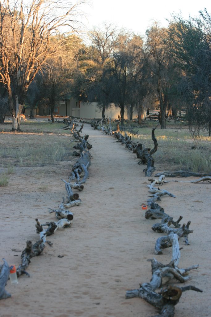 Hier is ‘n klompie netjiese huisies langs die rivierbedding gebou. Die paadjies van die lodge na die huisies is netjies met houtstompe uitgemerk.