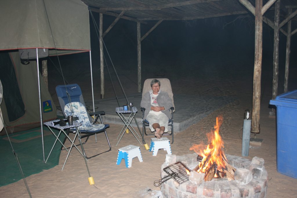 Gewapen met genoeg hout is ons terug kamp toe. Vanaand is dit my gunsteling, tjops en braaibroodjie. Dis effe koeler as gisteraand as ons laatnag nog die Kalahari TV dophou, die vuurtjie hier voor ons.