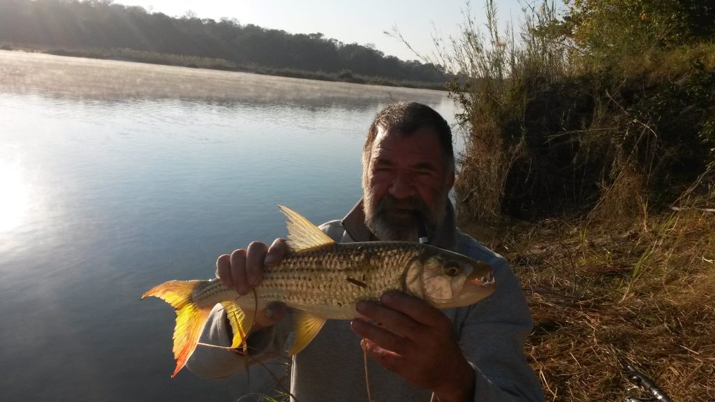 Wat ‘n ONGELOOFLIKE ervaring en ek verlang sommer na my drie seuns wat nou hier moes wees, en Swaerie en boetie Jan en sommer almal wat al saam met my visgevang het. Dit gaan klink na ‘n vissermanstorie as ek moet oorvertel wat ek nou hier beleef. Die buurman langsaan, nie ‘n visserman nie, staan nader as hy my uitbundige geroep hoor : Come to papa, come to papa, elke keer as ek een haak. Heelwat het natuurlik ook losgekom met die springslag as ek hom haak. Tiervis het ‘n manier om uit die water te spring, die oomblik as jy hom haak, dan moet jy die lyn heeltyd styf hou, anders is hy weg.