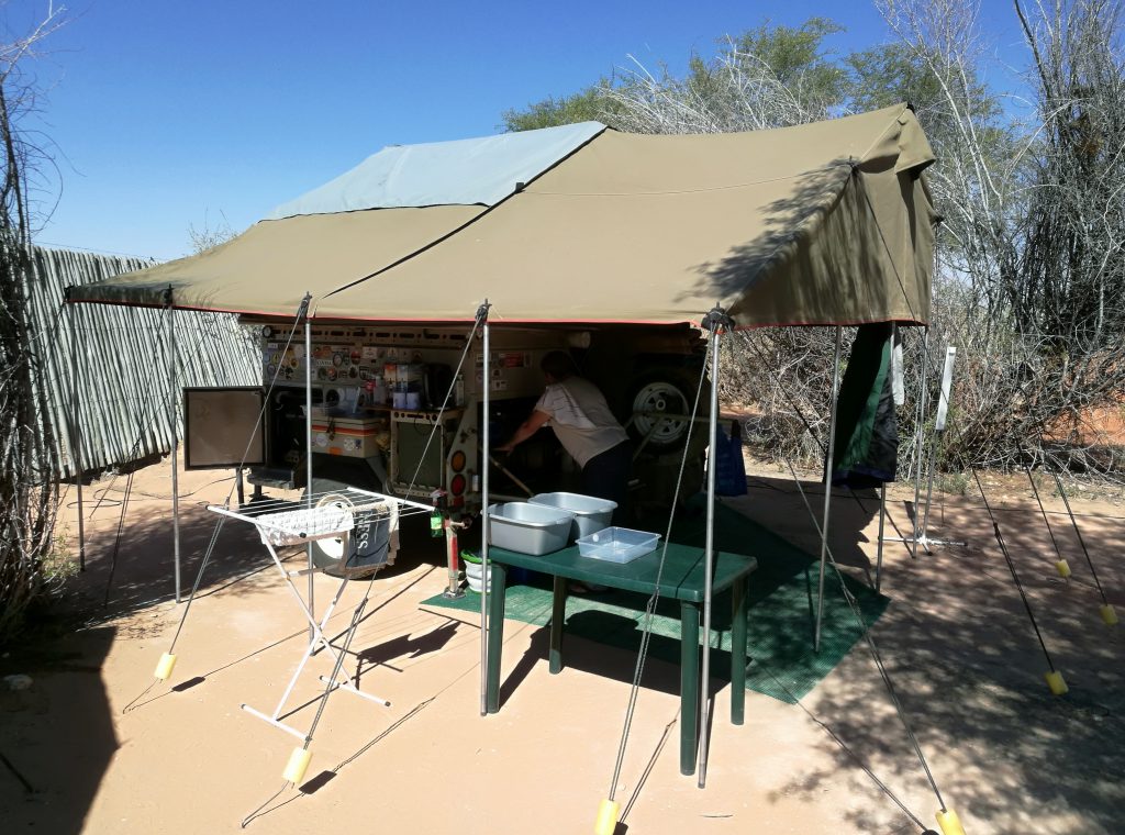 Vroegoggend is ons op, wil die son sien opkom van bo die duin af. Die Stanley is vol kookwater en die koffie en koppies gepak. Ons ry deur die rivierbedding tot bo-op die duin. Hier is ‘n stelasie gebou met ‘n groot oppervlak, glo dis vir groepe wat kuier. Ons klim op en wag vir die son.
