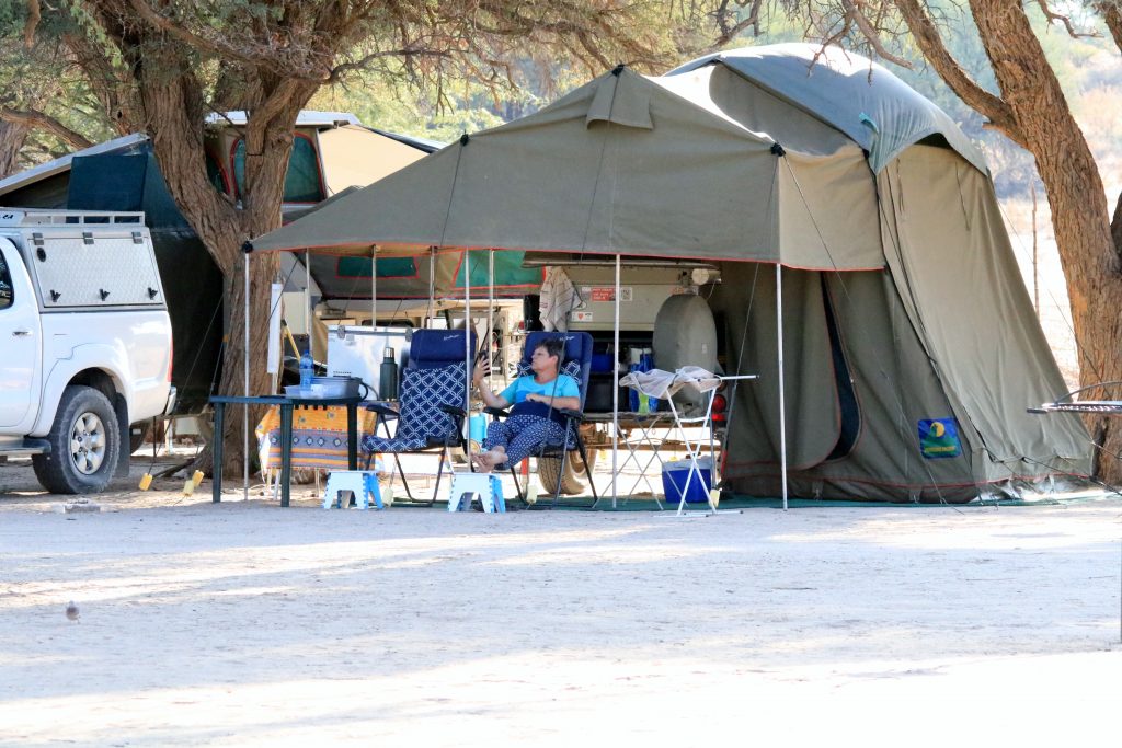 Ons boek in by die ontvangs in Mata Mata en gaan soek ‘n lekker staanplek. Ons is gelukkig om een te kry, hier onder een van die ou groot doringbome. Ons gaan ry ‘n draai laatmiddag en sien mooi diere.