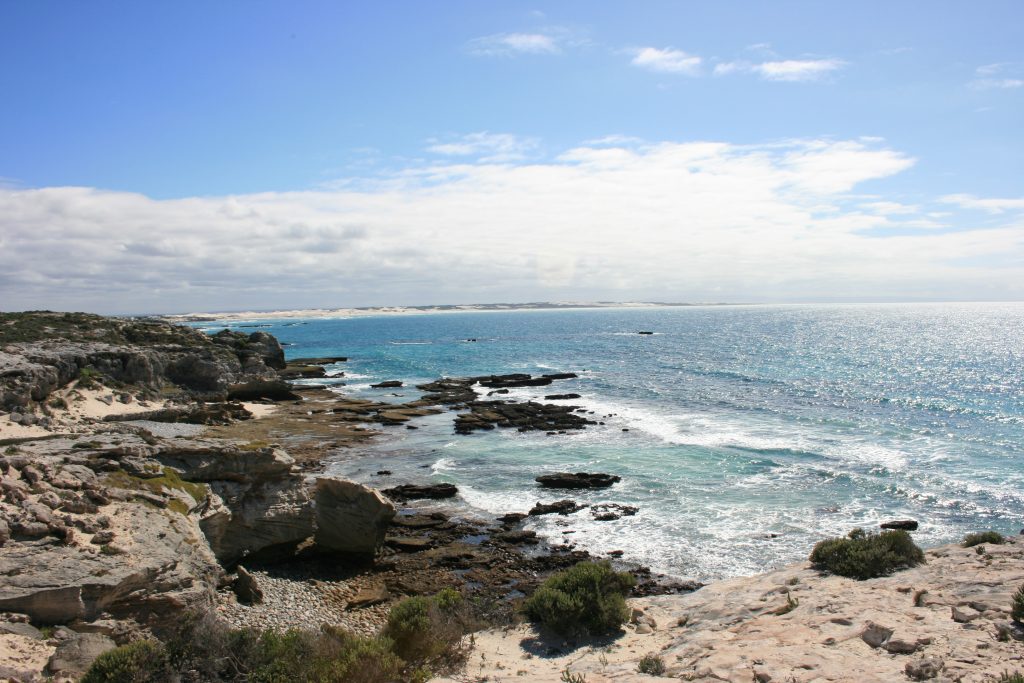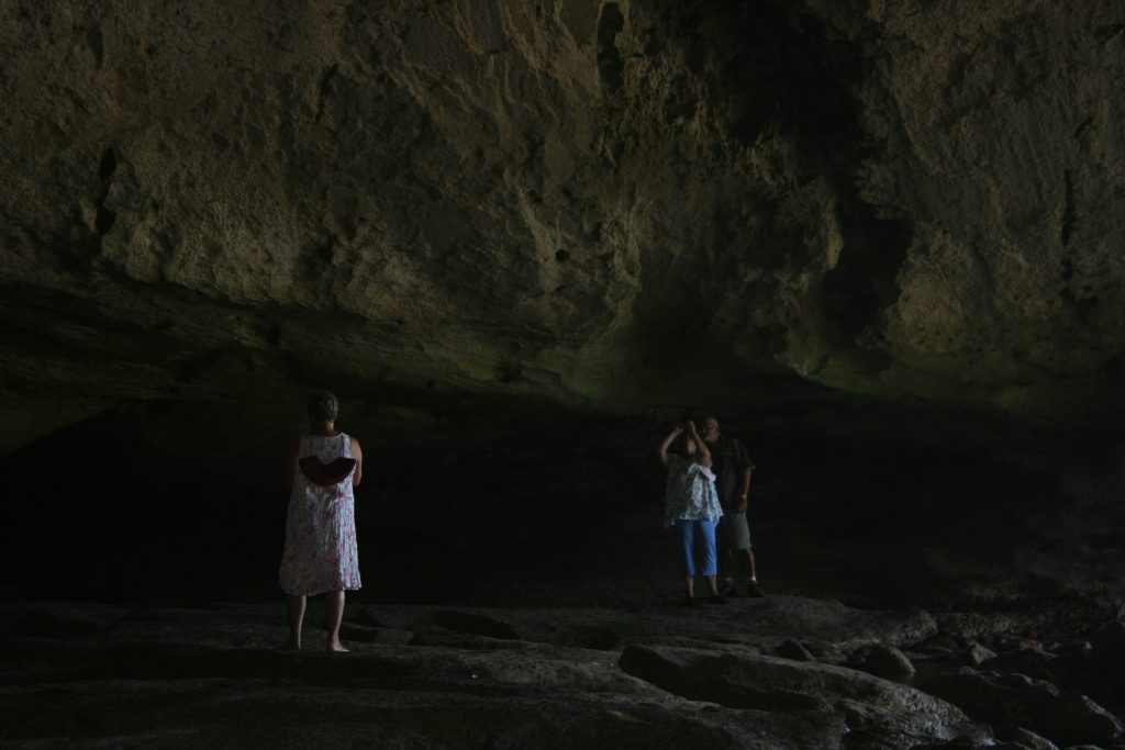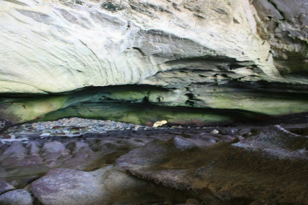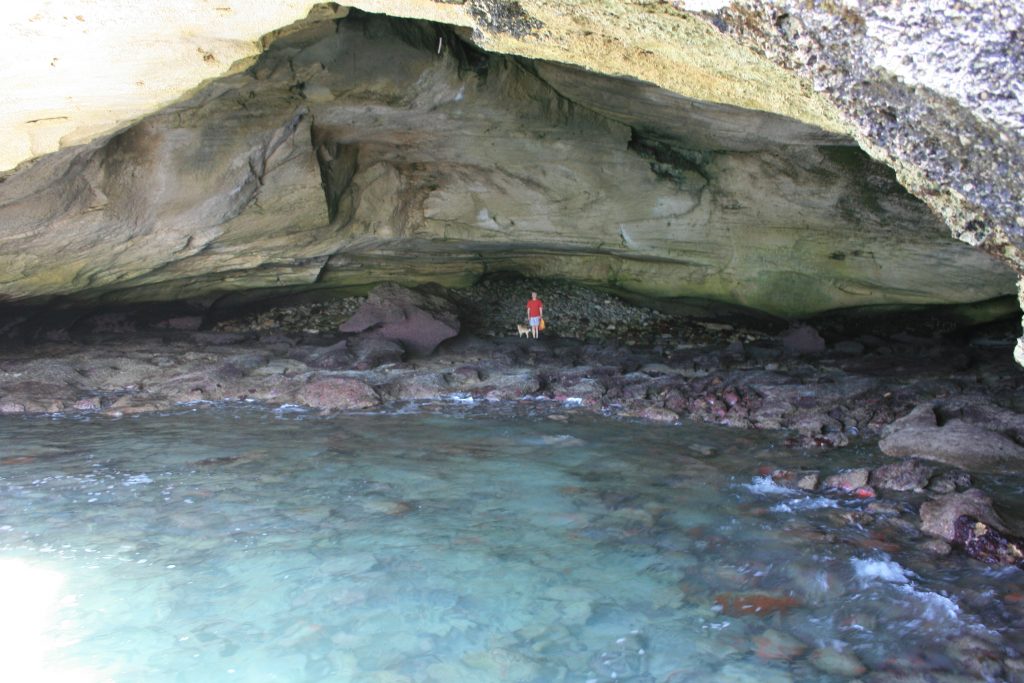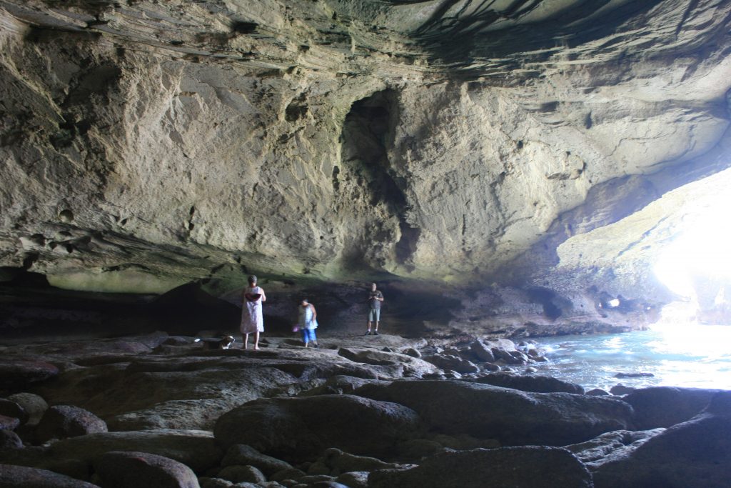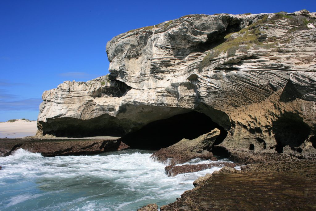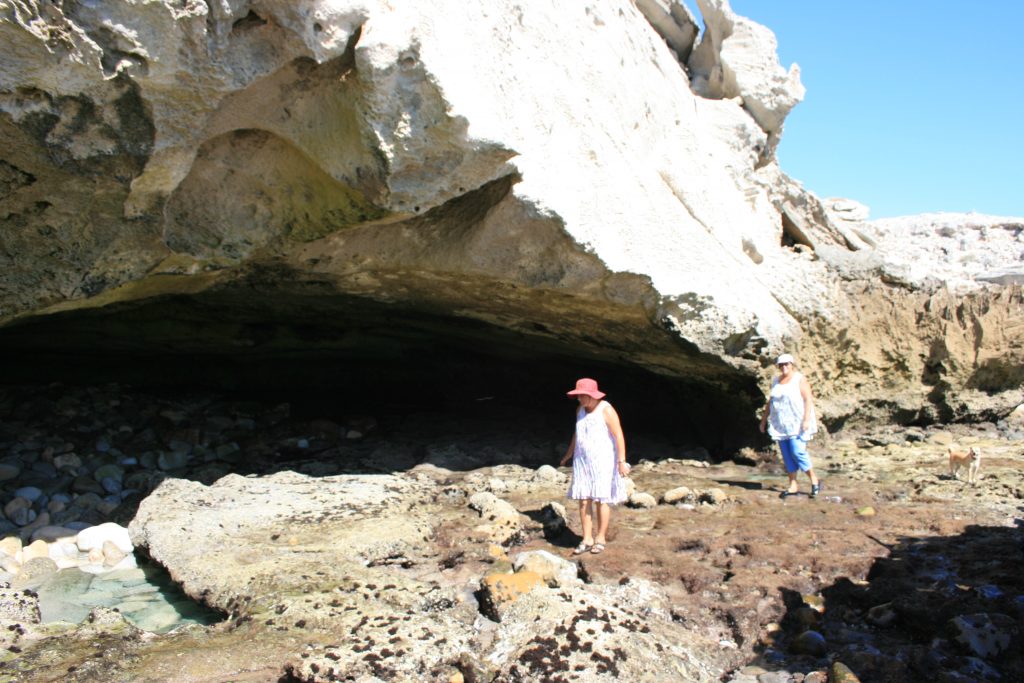 Vandag het ons ʼn afspraak met die bekende grot, so groot dat ʼn ossewa in hom kon draai en net behoorlik besigtig kan word as dit laagwater is. Na die koffie en shower is ons op pad, nie ver nie en mens kan amper soontoe stap, sowat twee km van die kampplek af maar ons ry en geniet die laaste paar honderd meter wat 4×4 vereis as gevolg van die los sand tot bo by die parkeerterrein by die uitkykpunt. Dis ʼn entjie se afklim van die parkeerterrein om by die see uit te kom. Dis laagwater en die rotsbanke is mooi oop. Ons stap versigtig op die gladde rotsbanke na die voorpunt vanwaar jy die grot van die see se kant af kan inkyk. Na ʼn paar foto’s loop ons weer terug en ontdek waar die ingang na die agterkant van die grot is, ʼn redelike klein opening waarheen jy gebukkend moet loop en waardeur jy klim en dan, die opening wat gaap na die see se kant toe wat jou begroet as jy deur is.