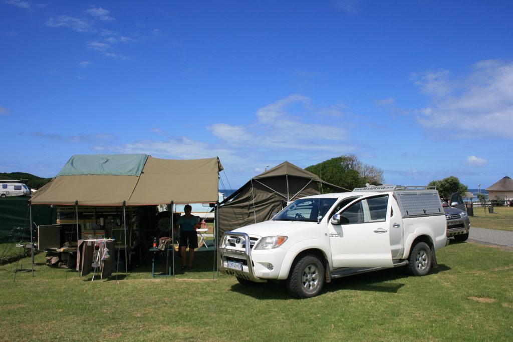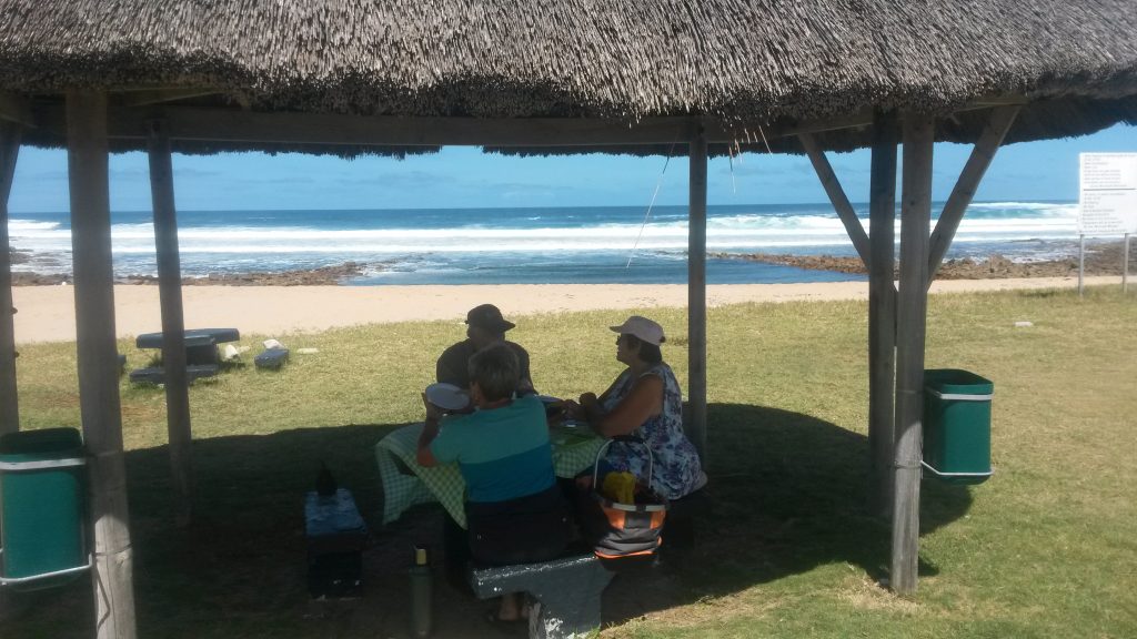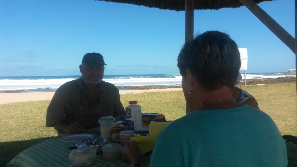 Dis lekker sonskyn weer en drukkend met die hoë humiditeit as ons opslaan, nie baie bome hier op die gras waar ons opslaan nie en die sweet tap my af. As die kamp staan, pak ons broodjies en koue vleise en stap see se kant toe, waar daar ʼn paar gras afdakkies met bankies en tafeltjie is. Die windjie is stil en die koelte van die grasdak bied ʼn lekker lafenis as jy hier langs die see sit en die uitsig waardeer.