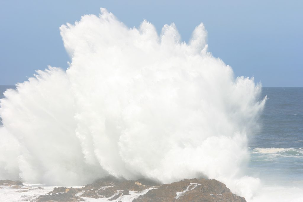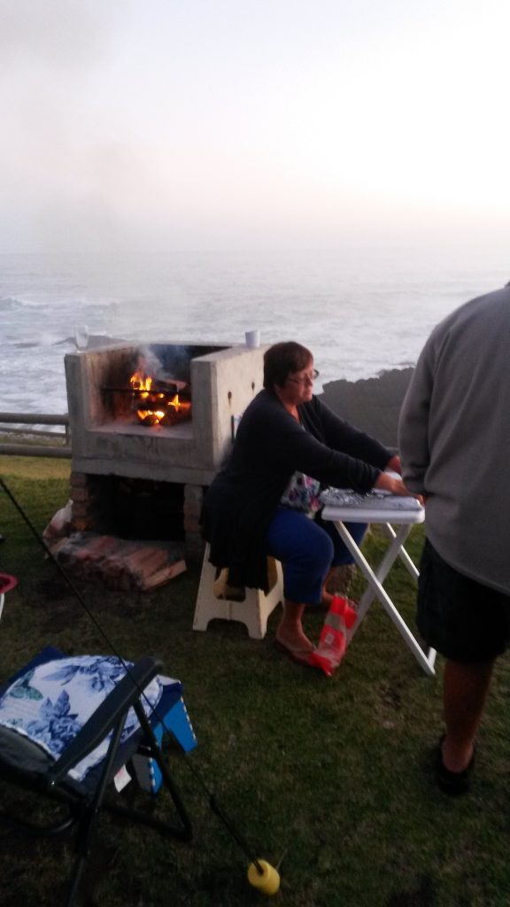 Ons stoele word hier voor langs die braaiplek uitgesit met die mooiste uitsig oor die see, die branders wat teen die rotse hier voor ons breek en water meters hoog die lug in skiet, elke keer ʼn Kodak moment. Dis prentjiemooi.